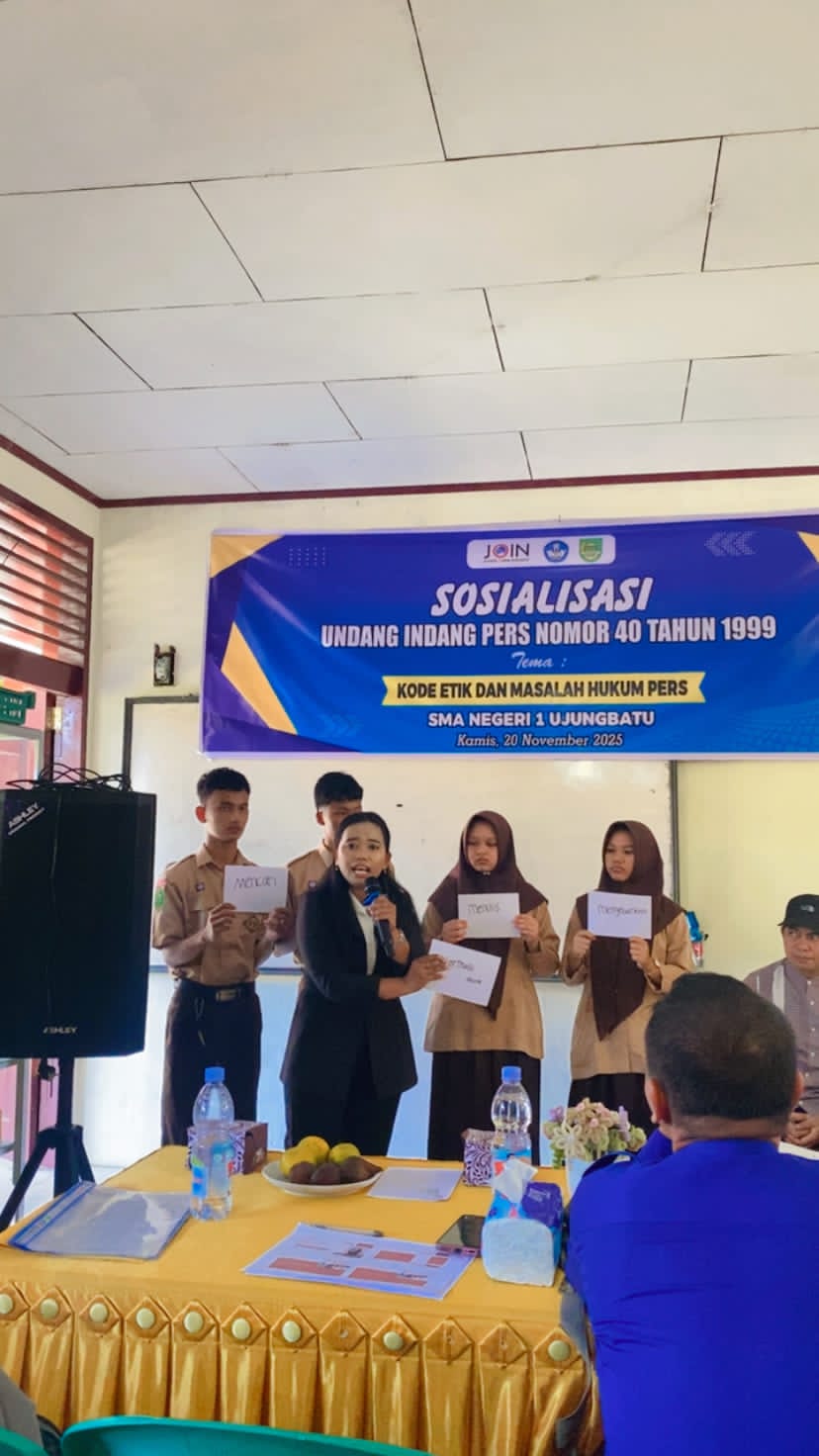 Sejagatnewscom (Rohul) Ujung Batu — Palasroha Tampubolon, Ketua DPD-JOIN Kabupaten Rokan Hulu, memimpin Sosialisasi Undang-undang Pers Nomor 40 Tahun 1999 dengan tema “Kode Etik dan Masalah Hukum Pers dan Landasan Hukum Profesi Wartawan” di SMA Negeri 1 Ujungbatu. Kegiatan ini bertujuan meningkatkan kesadaran wartawan tentang pentingnya mematuhi kode etik dan hukum pers.